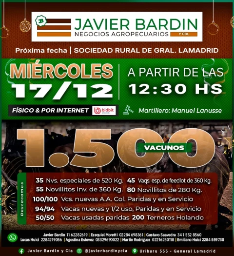 Ext.SIN OFERTASOrden: 4Lote 4 - 70 Terneros Cruza Braford, Brangus, Caretas, Angus Colorados y Negros de 200 Kg. en 9 de Julio |